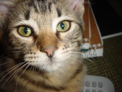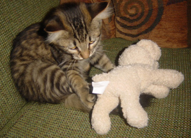 norah is a three month old longish hair tabby. she is cuddly and hyper and sweet and currently norah and jezz hate one another. ah well. i love them both.
